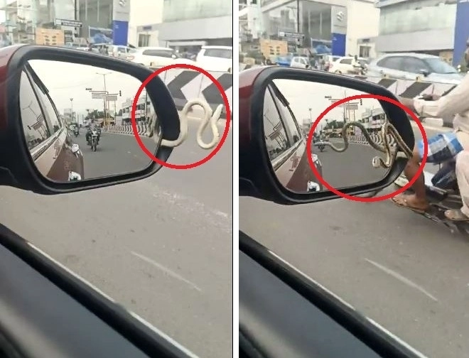 11일(현지시간) CNN-뉴스18에 따르면, 인도 타밀나두주 나마칼-살렘 도로에서 주행 중이던 차량의 사이드미러에서 뱀이 빠져나오는 아찔한 순간이 영상에 담겼다.