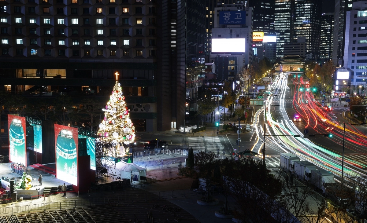 ‘2025 성탄트리 점등식’이 열린 17일 서울 중구 서울시청 앞 서울광장에 설치된 성탄트리가 밝게 빛나고 있다. 올해 성탄트리는 내년 1월 1일까지 운영될 예정이다.